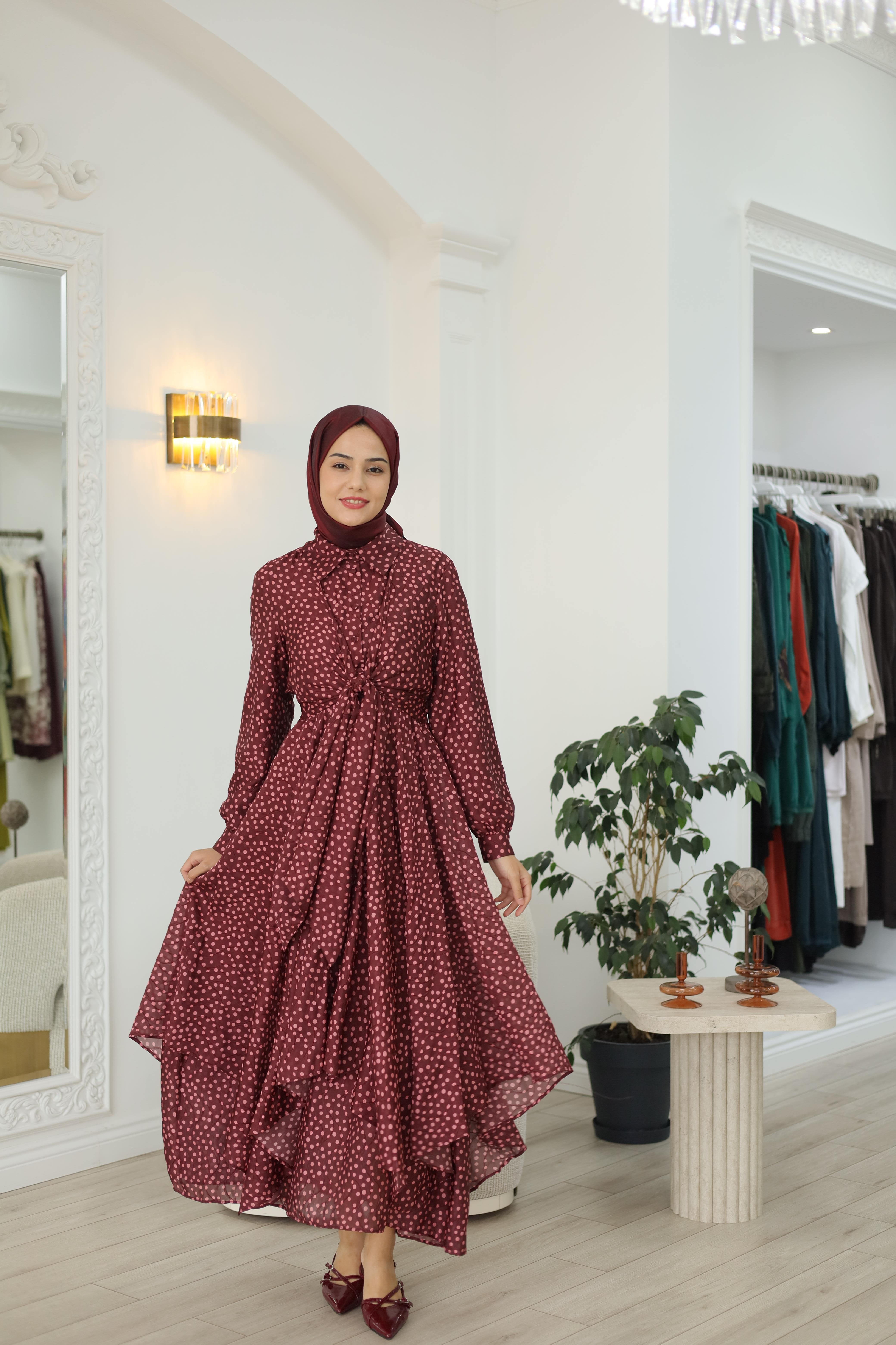 • Model Boy: 174, Kilo: 62 ELBİSE Boy: 145 cm Gögüs: 100 cm Bel: 92 cm Basen kısmı kloştur. • Kumaş Türü: Şİfon kumaştır.