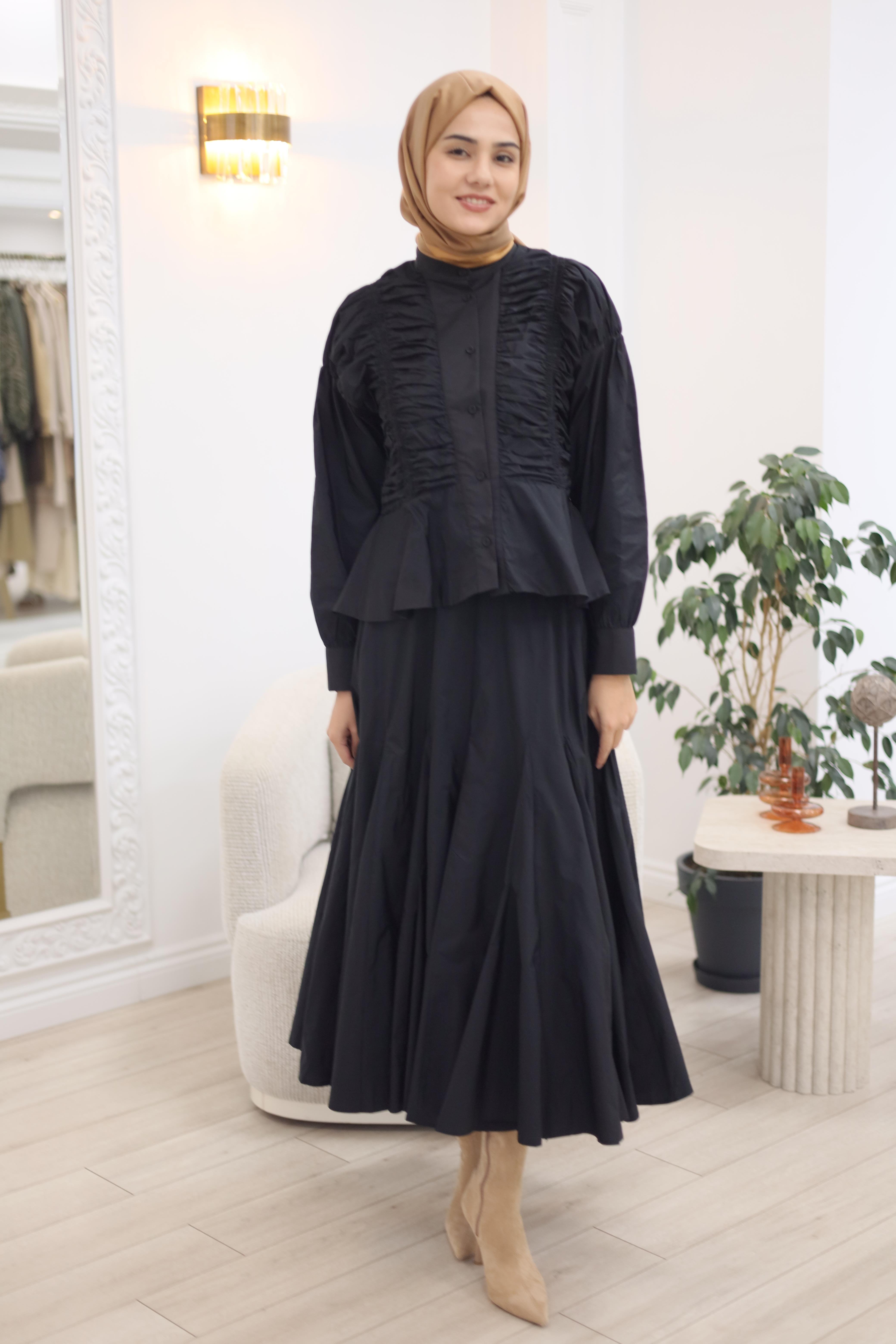 • Model Boy: 174, Kilo: 62 GÖMLEK Boy: 65 cm Gögüs: 100 cm Bel: 96 cm ETEK Boy: 90 cm Bel: 96 cm'e kadar esner LASTİKLİDİR. ASTARSIZDIR. Basen: 140 cm