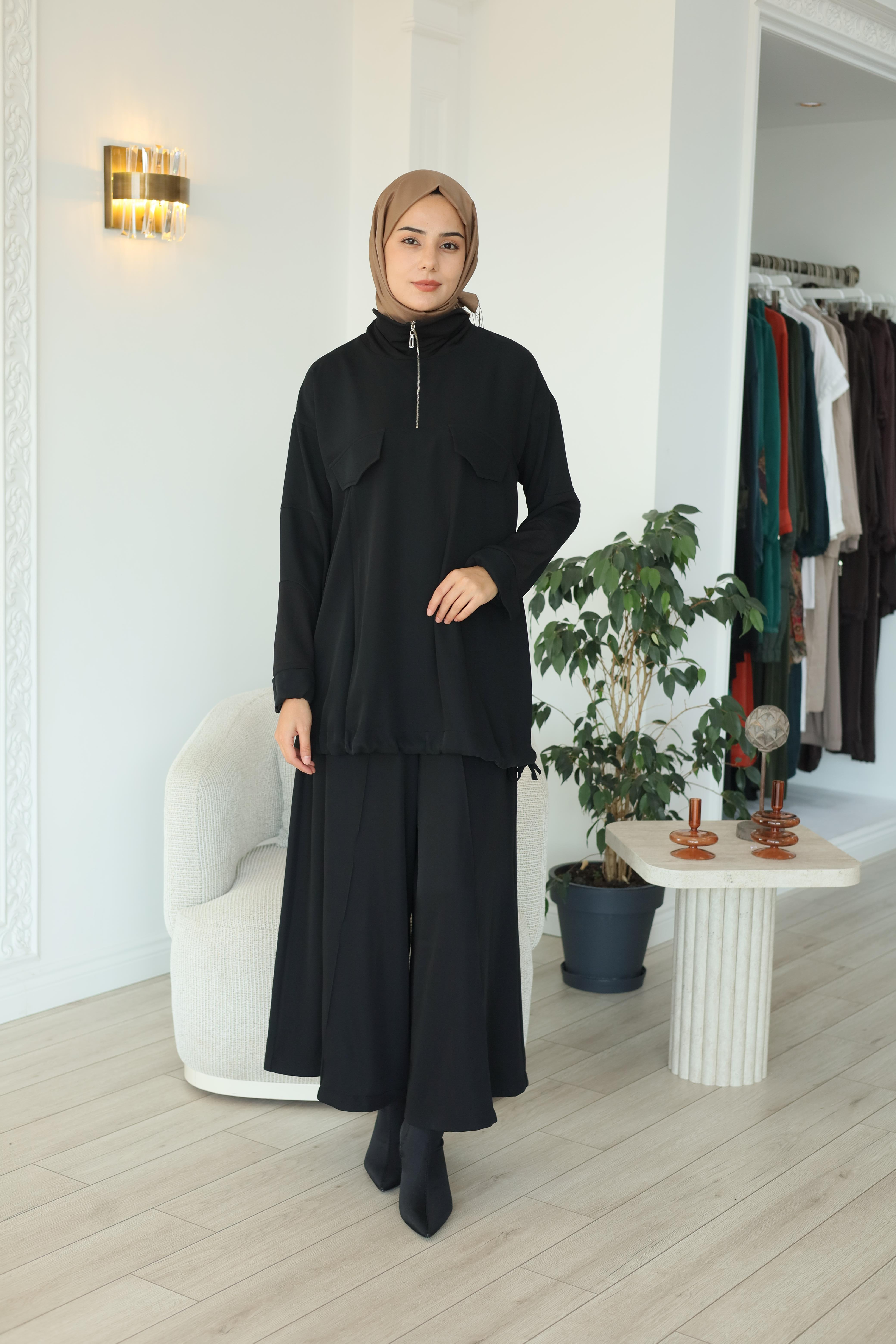 • Model Boy: 174, Kilo: 62 TUNİK Boy: 80 cm Gögüs: 110 cm Bel: 114 cm PANTOLON Boy: 100 cm Bel: 88 cm'e kadar esneyebilir pantolon beli ön kısmı kemerli arka kısmı lastiklidir. Basen: 130 cm