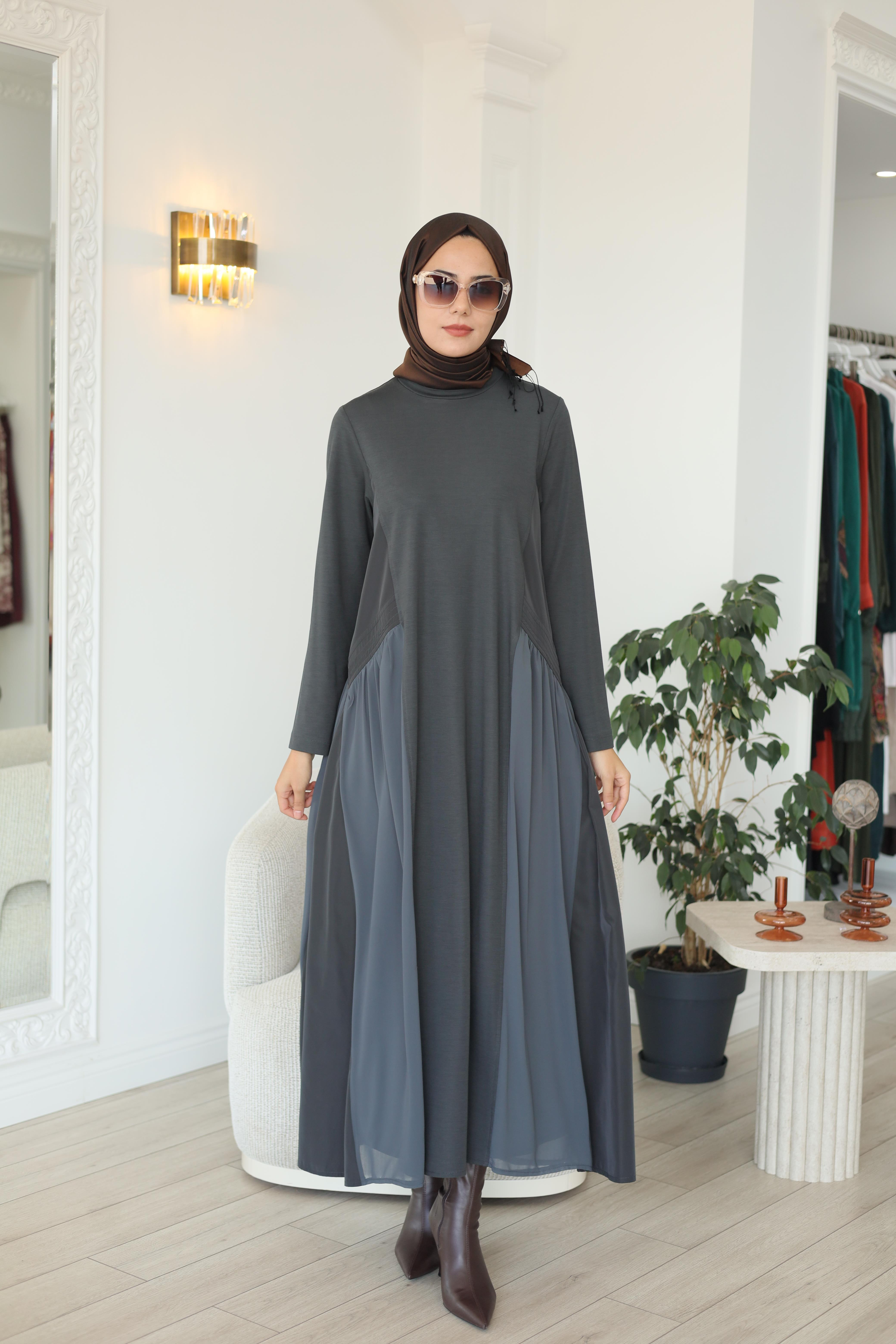 • Model Boy: 174, Kilo: 62 Boy: 140 cm Gögüs: 102 cm Bel: 120 cm • Kumaş Türü: Şifon ve Elastan