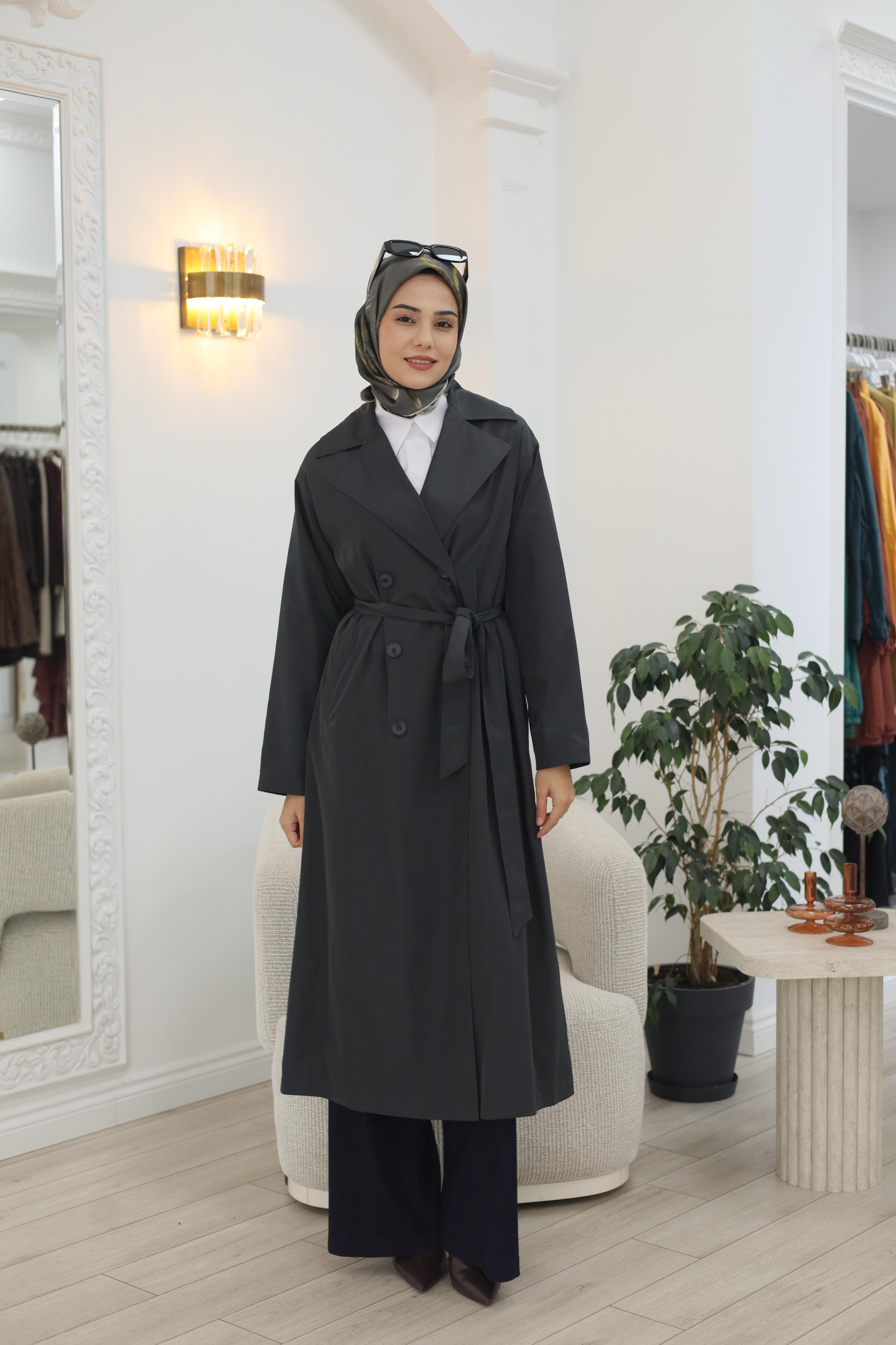 • Model Boy: 174, Kilo: 62 Boy: 130 cm Gögüs: 110 cm Bel: 114 cm Basen: 122 cm • Kumaş Türü: Su geçirmez trençkot kumaşı ÜRÜN ASTARLIDIR.